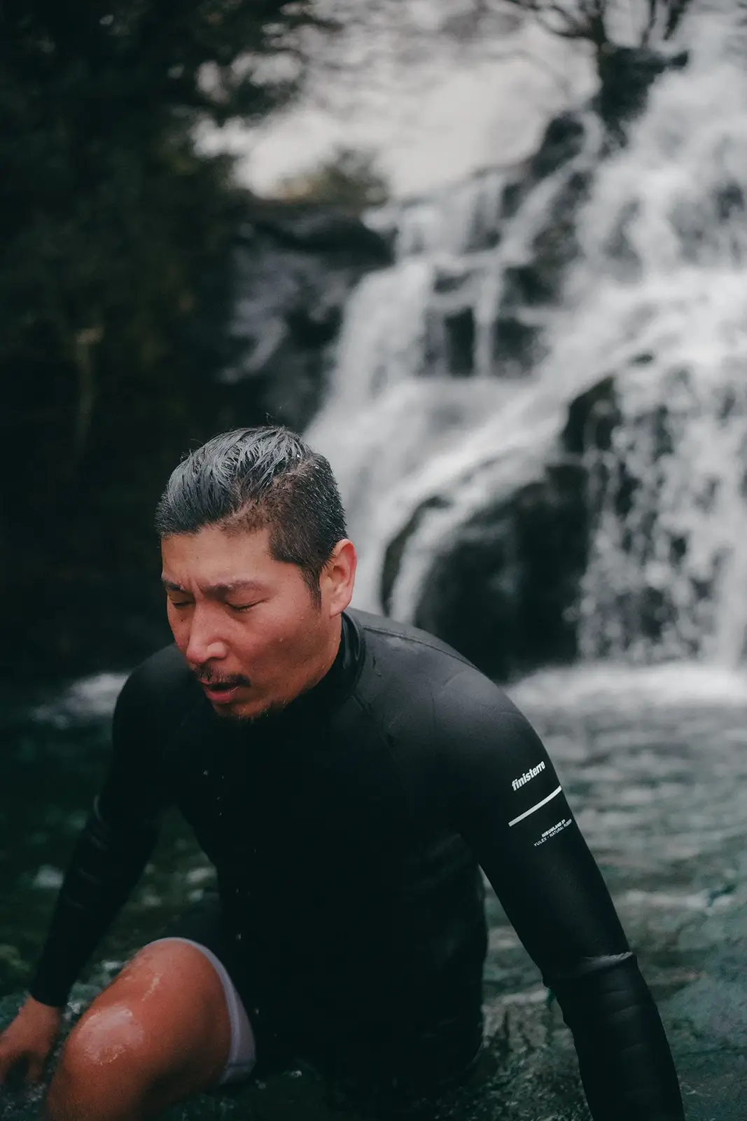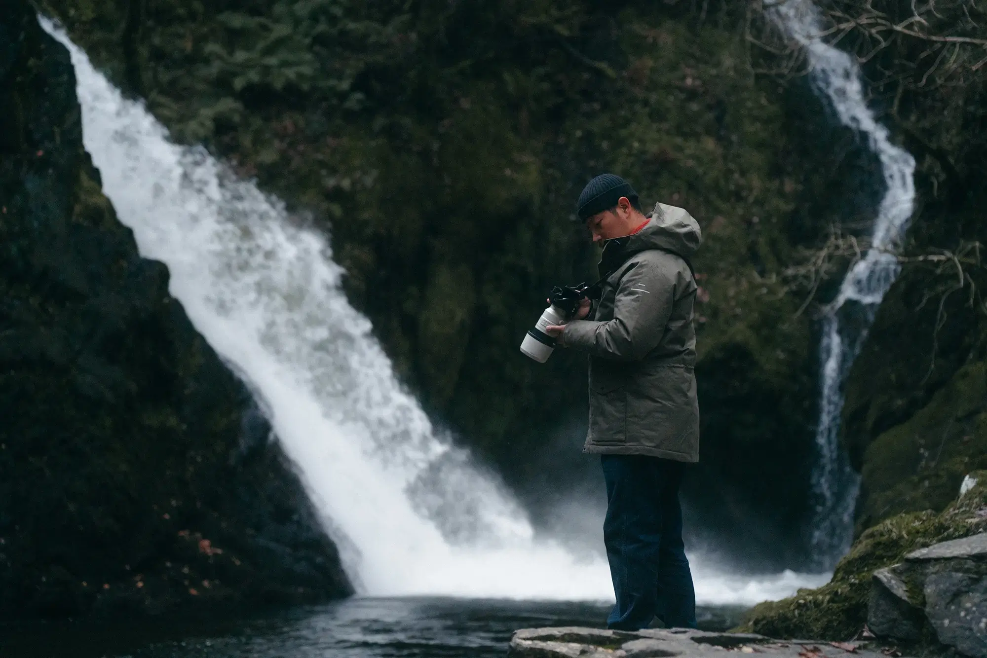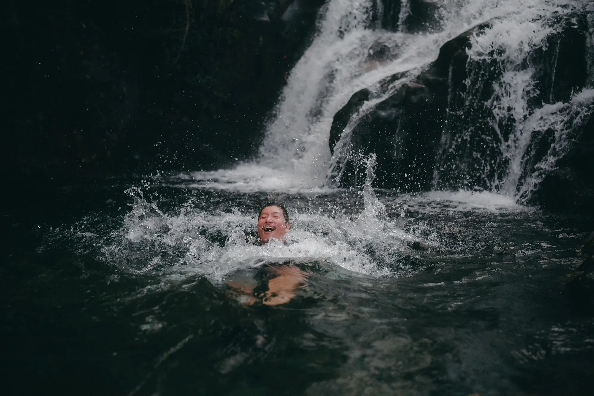 The shoot involved a hike up into the mountains, a wild swim beneath a waterfall, and a coffee-brewing scene outdoors.